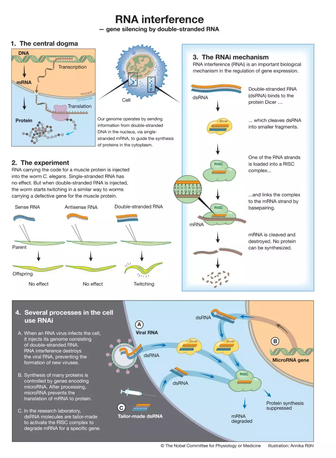RNAi的作用机制,让人们看到了实际应用的潜力(图片来源:Copyright ? The Nobel Committee for Physiology or Medicine. Illustration: Annika Rohl)