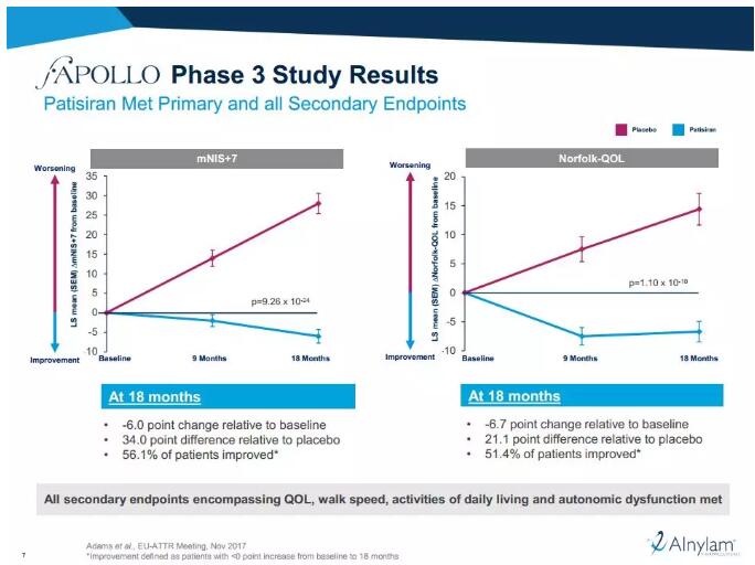 2017年9月,Alnylam与其合作伙伴赛诺菲一道,公布了patisiran在3期临床试验中的积极顶线结果。研究表明,这款新药抵达了主要临床终点,以及所有的次要临床终点。在18个月的节点上,与安慰剂相比,patisiran显着减少了患者的神经学病变,提高了他们的生活质量。