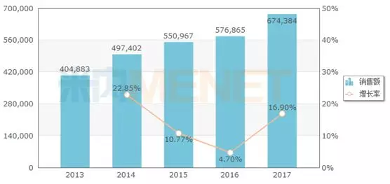 图3:2013-2017年中国公立医疗机构终端抗抑郁药销售情况(单位:万元)