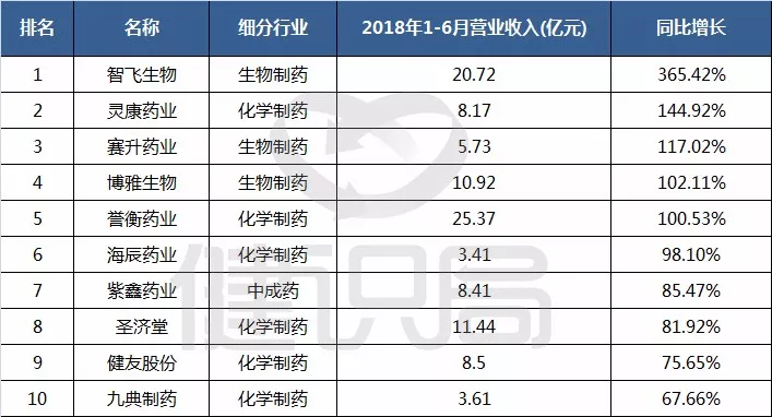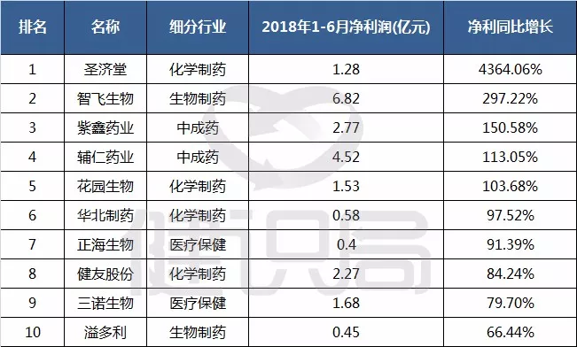 所披露的86家上市药企半年报中,净利润增速最快的前十企业中也有5家企业翻倍增长,其中圣济堂增速最快,超过43倍;其后是智飞生物,净利增长接近3倍,录得近7亿元的净利。