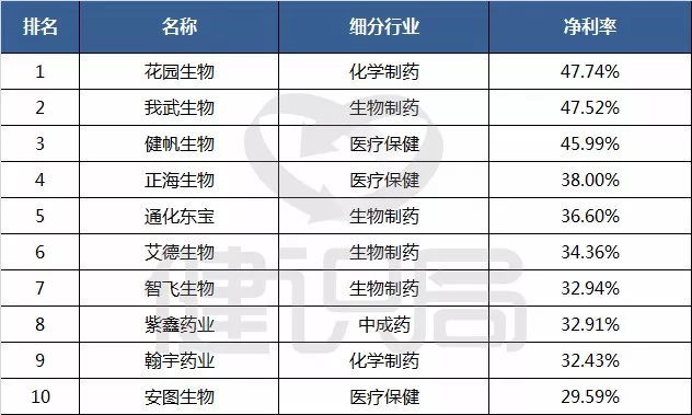 所披露的86家上市药企半年报中,净利润率最高的前十企业的净利率均在30%附近或以上,其中花园生物、我武生物和健帆生物三家企业的净利润率超过了45%。