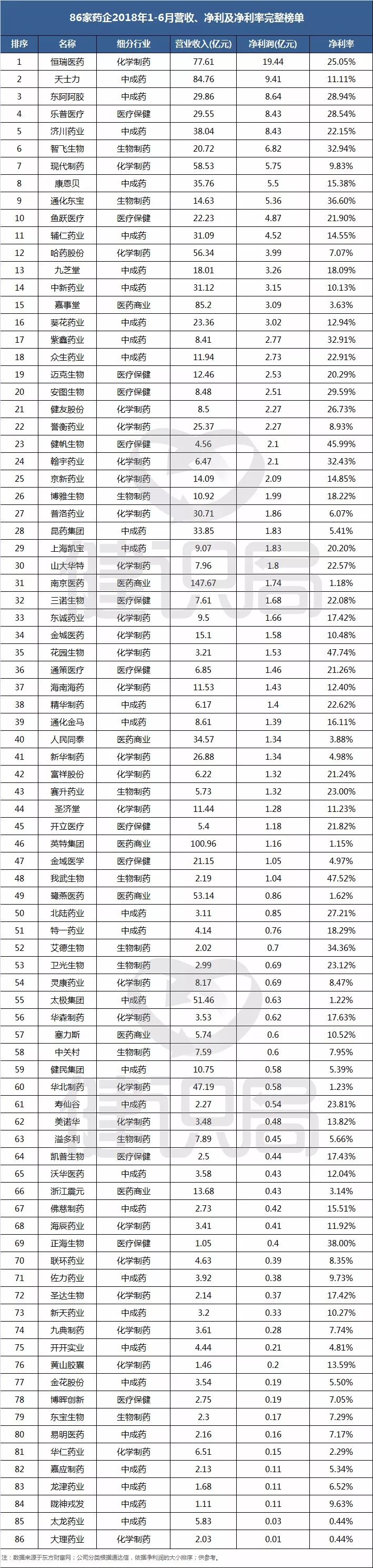 所披露的86家上市药企半年报中,净利润额最大的前十企业净利均在5亿元附近或以上。其中,恒瑞医药是绝对的老大,以近20亿元的净利高居榜首。