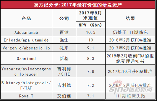 需要指出的是,上述大多数资产处于III期临床开发,但仍存在失败的风险。与商业发射和定价相比,能否成功通过III期临床并获得监管批准才是真正的挑战。例如,艾伯维ADC药物Rova-T和罗氏的AMD药物lampalizumab均上榜《2017年最有价值的新药研发资产》,均在III期临床失败。但上榜多数项目都已获得了批准: