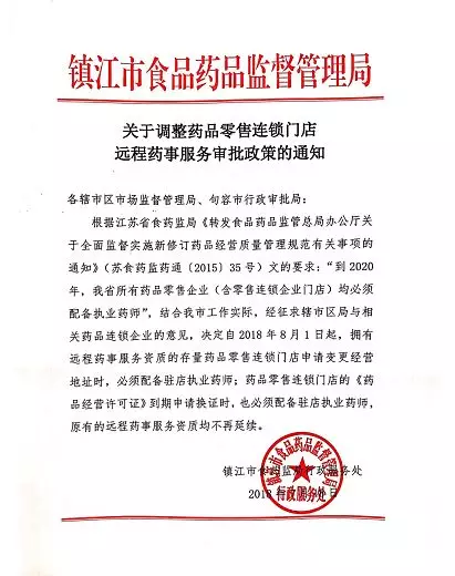 2018年7月18日,镇江市食品药品监督管理局下发《关于调整药品零售连锁门店远程药事服务审批政策的通知》。通知称,自今年8月1日起,拥有远程药事服务资质的存量药品零售连锁门店申请变更经营地址时,必须配备驻店执业药师。药品零售连锁门店的《药品经营许可证》到期申请换证时,也必须配备驻店执业药师,原有的远程药事服务资质均不再延续。
