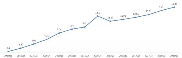 2015年3月4日,Opdivo成为全球首个获批非小细胞肺癌(NSCLC)适应症的PD-1抑制剂,其营收在接下来的一年半的时间里迅速爆发 —— 从2015Q1仅4000万美元的营收,到2018Q2已达16.27亿美元,增长超过40倍。