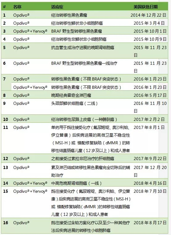 在美国,Opdivo已拿下了16个适应症,涉及肺癌(NSCLC和SCLC)、黑色素瘤、肾细胞癌、经典霍奇金淋巴瘤、头颈部鳞状细胞癌、尿路上皮癌、结直肠癌、肝细胞癌等8个瘤种。