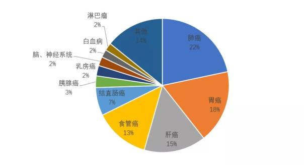 中国市场不仅庞大,且发病种类也很特殊。根据《2018年全国癌症最新报告》,肺癌为中国发病率、死亡率第一位。胃癌、肝癌的死亡率也高居第二、第四位。在中国的癌症患者中,每两位癌症患者中,就有一位属于肺癌、胃癌或肝癌。