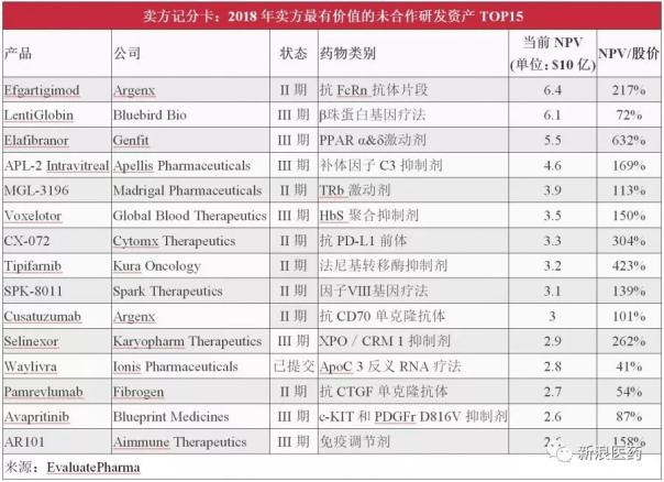 近日,该机构再发布《2018年最有价值的未合作新药研发资产TOP15》,对来自小型生物制药公司但未与大型制药公司达成合作的在研新药资产进行了分析。其中,比利时制药公司Argenx的实验性药物efgartigimod以64亿美元的净现值(NPV)排在首位,该药是一种抗FcRn抗体片段,目前处于II期临床,开发用于全身性重症肌无力(gMG)的治疗。来自蓝鸟生物(Bluebird Bio)的β珠蛋白基因疗法LentiGlobin和Genfit公司的PPAR α&δ激动剂elafibranor以61亿美元和55亿美元的NPV排在第2、3位,这2个药物均已处于III期临床开发,分别用于治疗地中海贫血/镰状细胞病和非酒精性脂肪性肝炎(NASH)。