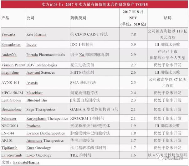 另外,2017年榜单中,来自Loxo肿瘤学公司的靶向抗癌药Larotrectinib以4亿美元授权给了德国制药巨头拜耳集团。而Incyte、Axovant、Prothena可以说是最大的输家,这3家公司的药物Epacadostat、Intepirdine、NEOD001在2017年榜单中的NPV分别为59亿、26亿、19亿美元,但均在III期临床遭遇失败,导致股价暴跌。其中Epacadostat的滑铁卢事件甚至引起了IDO领域其他制药公司股票大幅缩水,为该领域的投资前景蒙上了厚重的阴云。