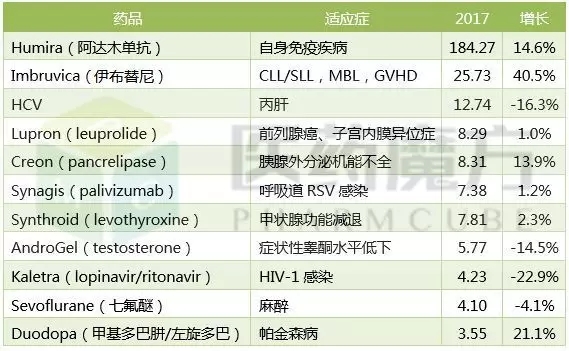 资料显示,2017年的全球药物销量排行榜中,修美乐以185亿美元牢牢占住第一的宝座,第二名为新基制药的来那度胺【瑞复美】,销量为81.87亿美元,仅是修美乐的44%。