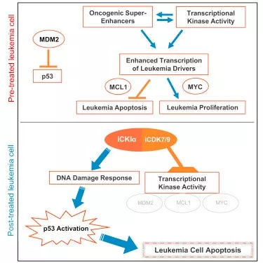 抑制CDKIα能够激活肿瘤抑制基因p53,它可以导致肿瘤细胞的凋亡。而致癌基因激活的超级增强子(super-enhancer)通常会激活包括MDM2、MCL1、和MYC在内的一系列基因的表达来抑制p53基因的活性,防止细胞凋亡和加快细胞增殖。而这些超级增强子的特点是他们对CDK7/9蛋白的活性非常敏感。抑制CDK7/9蛋白活性可以抑制超级增强子的作用,从而让肿瘤细胞对p53的作用更为敏感。