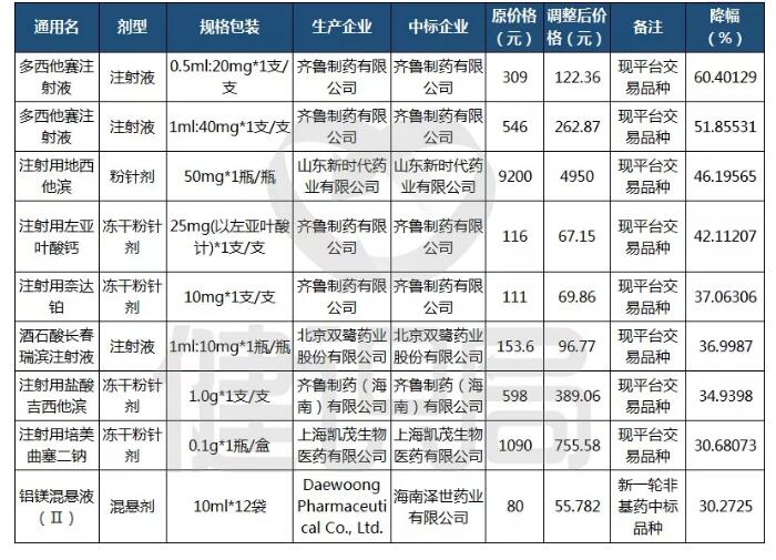 海南省降价幅度排名前九位的大多数为国产仿制药,特别是齐鲁制药的多西他赛注射液,降幅超过60%。