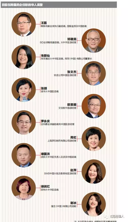 时至今日,越来越多的跨国药企选择华裔或者本土成长起来的职业经理人担任中国区负责人。根据统计,目前跨国药企在中国的最高负责人大多数皆由本土制药管理人才担任,其中2017年跨国药企业绩排行榜前10名中有6家的中国区最高负责人由华人职业经理人担任。这其中包括强生、诺华和罗氏等知名跨国药企,也充分表明了跨国药企管理层对于华人高管在中国市场上能力的肯定。