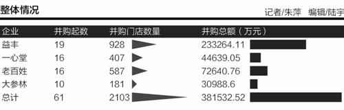 另据21世纪经济报道记者不完全统计,2017年初至今,益丰大药房、一心堂大药房、老百姓大药房、大参林医药四大上市药店共发起61起收购共2103家零售门店。