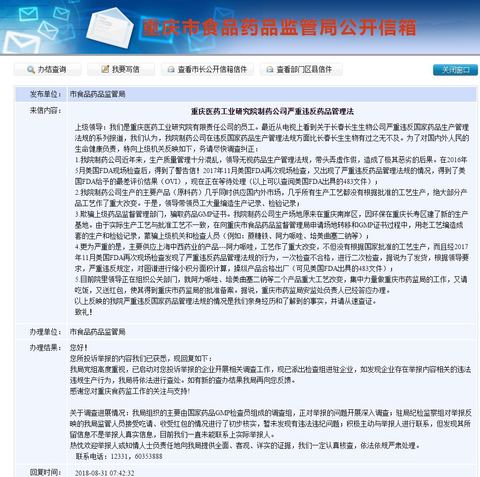 6、重庆食药监局已就该信件所反映的内容开展相关调查,并已于2018年8月23日对重庆医工院进行了飞行检查,飞行检查的结果尚待结论性意见。