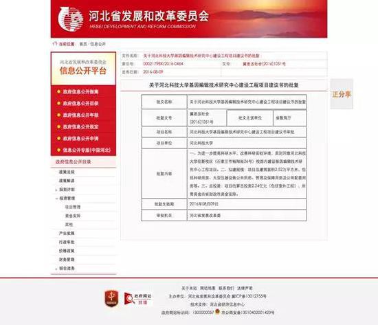 这是河北省发改委批复的项目,总建筑面积2.52万平方米,包括科研用房、大型仪器设备公共用房、管理及保障用房及公用配套用房等。