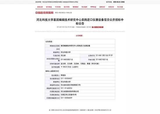 (3)河北科技大学基因编辑技术研究中心采购进口仪器设备项目(2016年8月-9月)