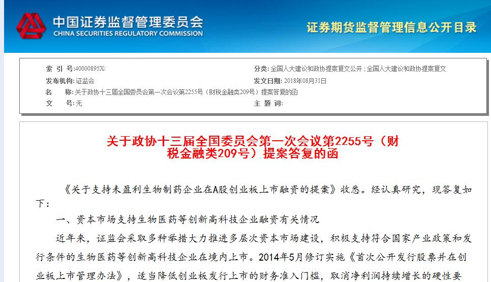 近日,证监会发布的一则《关于政协十三届全国委员会第一次会议第1180号(财税金融类110号)提案答复的函》提到,对《关于支持未盈利生物制药企业在A股创业板上市融资的提案》已收悉,其中,值得一提的是,证监会在回函表示,将依法创造条件引导尚未盈利或未弥补亏损的生物医药等创新企业发行股权类融资工具并在境内上市,这意味着符合条件的未盈利生物制药企业或可以在A股创业板上市。