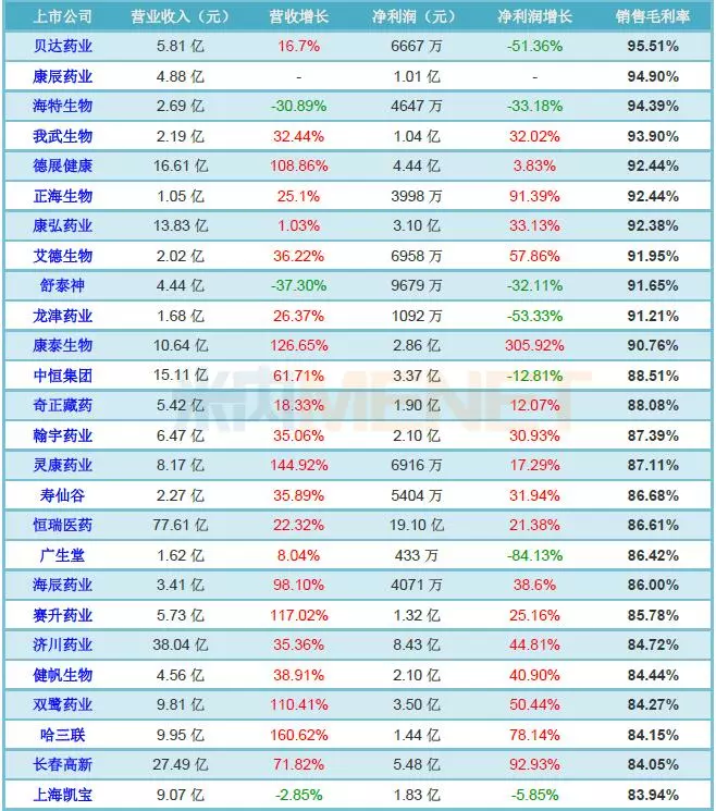 2018年的中报已披露完毕,A股医药相关企业(含医药制作及医疗行业)共280家中有40家药企的毛利率超过80%。贝达药业、康辰药业、海特生物、我武生物、正海生物、德展健康、康弘药业、艾德生物、舒泰神、龙津药业、康泰生物的毛利率更是高达90%以上,这11家“暴利”企业究竟是葫芦里卖了什么药呢?