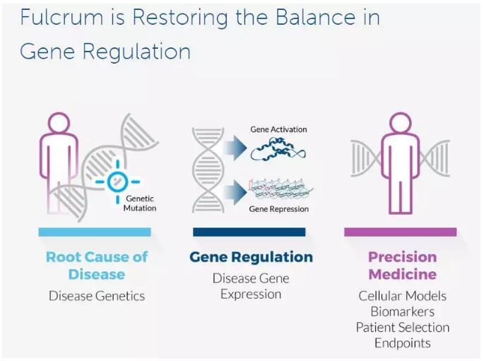 Fulcrum成立于2016年,位于美国马萨诸塞州剑桥市。该公司专注于研发可以调控基因表达的小分子创新药物。其技术平台能够首先发现导致不同疾病的遗传基础,然后通过细胞模型模拟疾病情况下的基因调控,并且可以利用这些细胞模型对候选药物进行筛选,从而找出针对特定基因失调的创新疗法。除此之外,Fulcrum也在研发针对镰刀型细胞贫血病、杜氏肌营养不良症(DMD)以及脆性X综合征(FXS)的疗法。