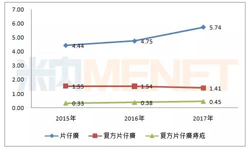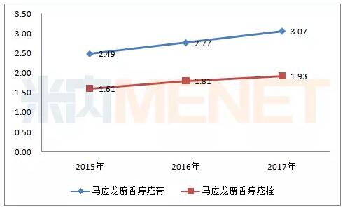 图4:2015-2017年马应龙麝香痔疮系列产品在中国城市零售药店销售情况(单位:亿元)(来源:米内网中国城市零售药店终端竞争格局)