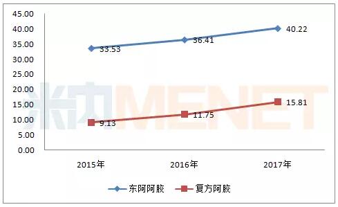 图6:2015-2017年东阿阿胶系列产品在中国城市零售药店销售情况(单位:亿元)(来源:米内网中国城市零售药店终端竞争格局)