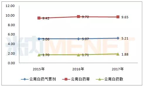 图8:2015-2017年云南白药系列产品在中国城市零售药店销售情况(单位:亿元)(来源:米内网中国城市零售药店终端竞争格局)