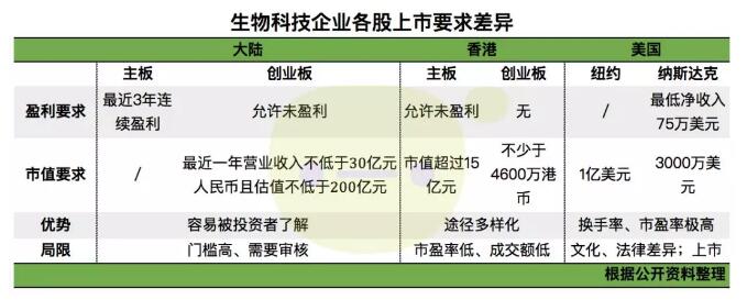 今年3月,证监会《关于开展创新企业境内发行股票或存托凭证试点的若干意见》(以下简称《意见》)要求最近一年的营业收入不低于人民币30亿元。此外,在企业估值方面,《意见》要求最近一年估值不低于人民币200亿元。《意见》所涉及的企业包括未盈利生物制药企业,但这一上市门槛与港股相比,要高很多。
