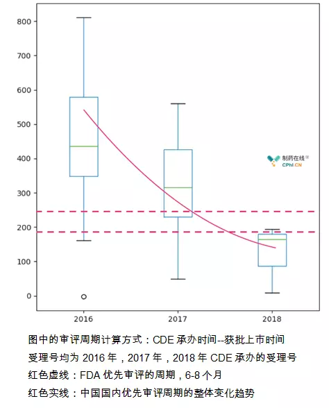 1. 中国上市品种的优先审评周期正在快速缩减,2016年审评周期中位数为约420天,2017年约为10个月。2018年仅有3个可用数据,统计结果并不准确,仅供参考。