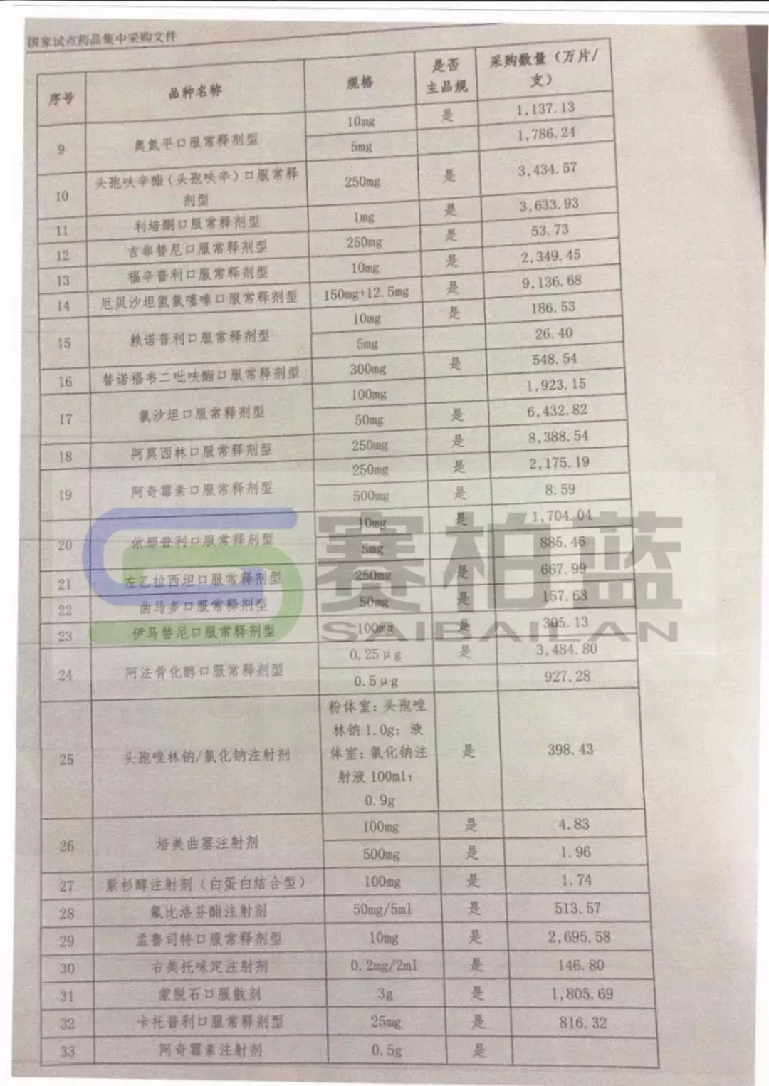 据赛柏蓝报道,9月11日上午,国家医保局主导的试点联合采购在上海召开座谈会,试点采购办公室工作人员和请相关企业负责人出席,会议介绍了联合采购要求及操作方法,并公布了第一批带量采购清单,共33个品种,均为通过一致性评价的产品,降价可以获得70%的市场!