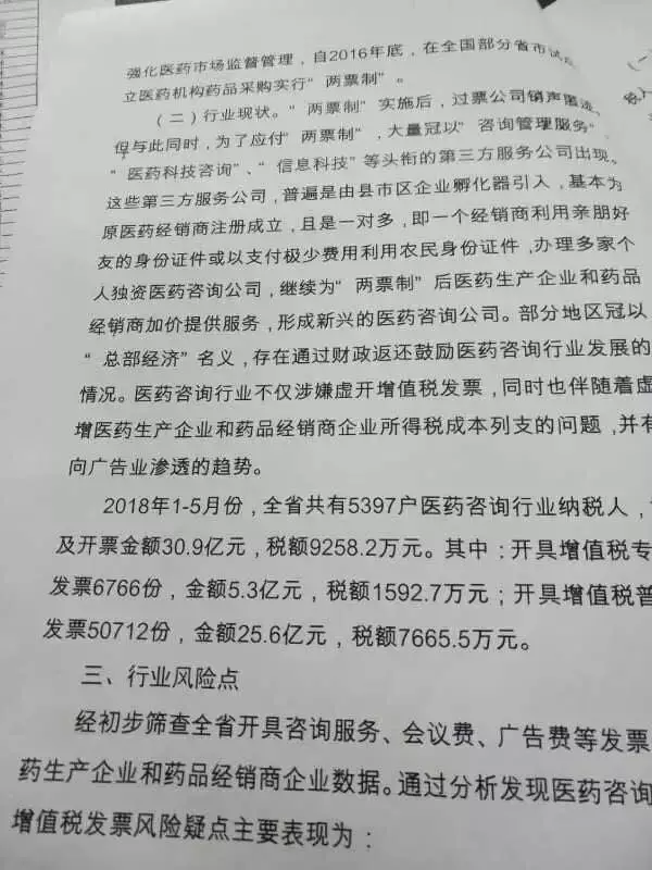 医药咨询行业不仅涉嫌虚开增值税发票, 同时也伴着虚增医药生产企业和药品经销商企业所得税成本列支的问题,并有向广告业渗透的趋势。