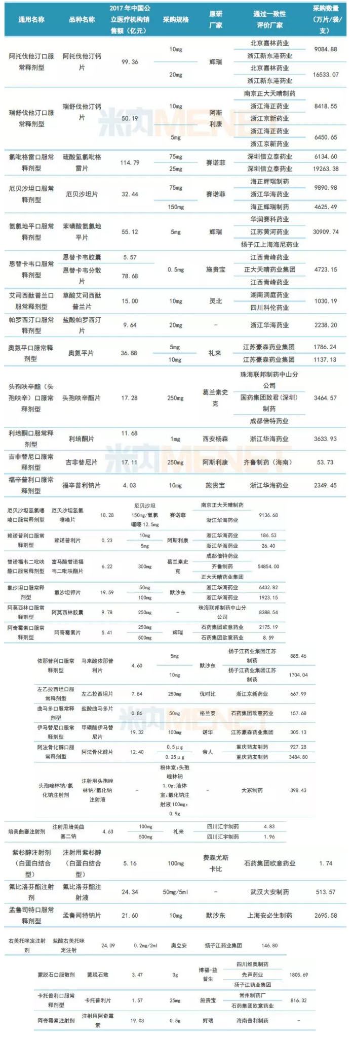 据米内网数据统计,本次试点采购清单入选的品种在2017年中国公立医疗机构(中国城市公立医院、县级公立医院、城市社区中心以及乡镇卫生院)终端销售额近800亿元,加上中国城市零售药店终端的销售额合计有近千亿。从各个品种销售额看,超过50亿元的有5个,其中硫酸氢氯吡格雷片以114.79亿元的销售额领跑,其原研厂家为赛诺菲。