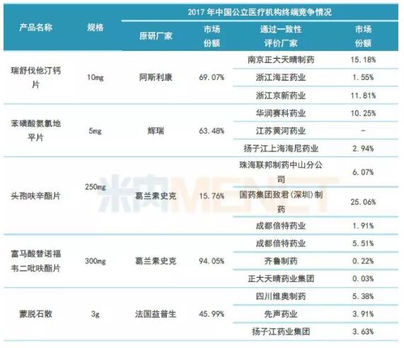 表4:一致性评价通过厂家数达2家的仿制药竞争情况(来源:米内网数据库)