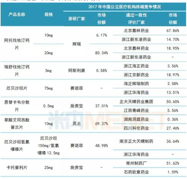 从7个品种在2017年中国公立医疗机构的终端竞争情况看,阿托伐他汀钙片(10mg)、瑞舒伐他汀钙片(5mg)、恩替卡韦分散片(0.5mg)、卡托普利片(25mg)、厄贝沙坦片(75mg)等品种的仿制药企业市场占比较高,为了保住原有的市场份额,一些占据较大市场份额的企业可能会在可以承受的降价幅度内选择降价。