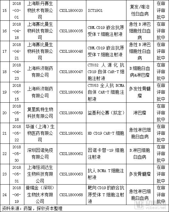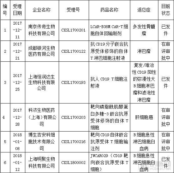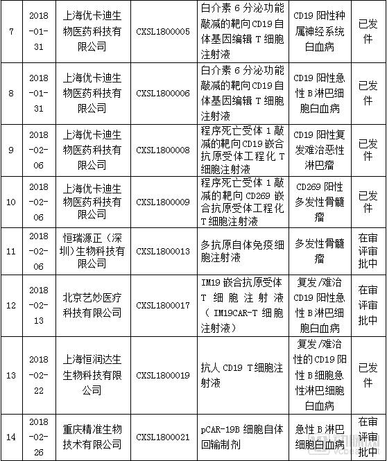 2017年11月,在《治疗用生物制品注册受理审查指南(试行)》的指导下,CDE开始受理国内CAR-T治疗药品临床试验申报。同年12月11日,南京传奇生物的CAR-T项目LCAR-B38M细胞制剂,以1类新药递交临床试验申请,成为CAR-T项目以药物进行监管后,首个国内提交的CAR-T项目临床试验申请。随后,部分公司CAR-T项目也相继获得新药研究申请审批受理。