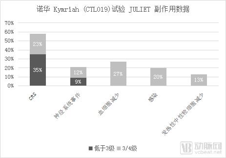 副作用方面,58%的患者出现CRS,其中有 23%出现 3/4 级 CRS(15%3 级,8%4 级)。 21%的患者出现了神经系统事件,并且 12%的 患者为 3/4 级。另外,分别有 27%、20%和 13%的患者发生持续超过 28 天的 3/4 级血细胞减少、3/4 级感染和 3/4 级发热性中性粒细胞减少的症状。输注后30天内有三名患者死于相关疾病持续恶化,但并没有出现脑水肿或死亡事件。