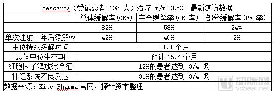 为评估 Yescarta 缓解的耐受性,Kite 对参与 ZUMA-1 研究的难治性侵袭性非霍奇金淋巴瘤患者(n=108)进行了最短一年的随访,后续随访证明效果确实显着。在传统治疗下只能生存 6 个月的DLBCL 晚期患者,在接受 Yescarta 治疗一年后仍有一半以上患者存活,中位生存期预计15.4个月。