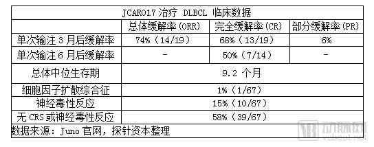 但Juno的另一款产品JCAR017在治疗复发或难治的B细胞非霍奇金淋巴瘤中安全性和治愈率好于诺华。该药已获得了美国FDA授予治疗r/r侵袭性大 B细胞NHL的突破性疗法认证,同时也被欧洲EMA授予治疗 DLBCL的PRIME资格。2017年12月9日,Juno在ASH年会上公布了其CAR-T疗法JCAR017治疗复发/难治性 CD19+非霍奇金淋巴瘤的阶段性试验成果。在接受了高剂量(DL2=1亿细胞)治疗的19例核心组患者中,3个月整体缓解率达到74%(14例),完全缓解率为68%(13例);6个月完全缓解率为 50%(7例)。