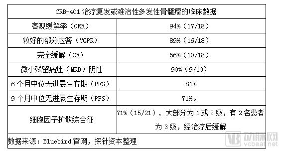 2017年12月,Celgene 和 Bluebird在ASH年会上联合公布了一项中位随访时间为40周(整体范围:6.6-69 )的CRB-401试验临床Ⅰ期结果。该试验评估了CAR-T 细胞疗法 bb2121在21名晚期复发或难治性多发性骨髓瘤患者中的安全性和疗效。数据显示: