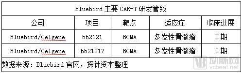 2013年3月,Bluebird和Celgene达成战略合作,共同开发 CAR- T疗法,签署的合作协议囊括里程碑金额合计达2.25亿美元。2015年6月,双方修订合作协议,决定重点开发靶向BCMA的候选药物,将重点集中于靶向B细胞成熟抗原(BCMA)CAR-T细胞疗法研究(bb2121),相关费用合计2500万美元。2018年3月,Celgene与bluebird达成合作研发协议,将共同研发和商业化bb2121疗法,美国地区研发费用和收益5:5分成,Celgene将独自运作bb2121在美国以外市场的药品生产和商业化事宜,Bluebird获得里程碑付款和销售分成。