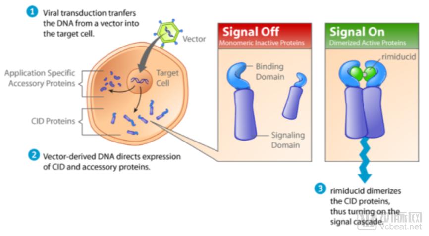 Bellicum的核心技术之一是分子开关rimiducid,通过给信号域引入并结合特殊设计的CID(化学诱导的二聚体化技术),给CAR-T疗法添加一个分子开关,通过小分子 rimiducid 来控制信号通路的开闭,使得细胞疗法变得更可控;从而解决了个体差异大、剂量难以控制、易出现严重副作用等问题,对治疗效果进行质量调控。