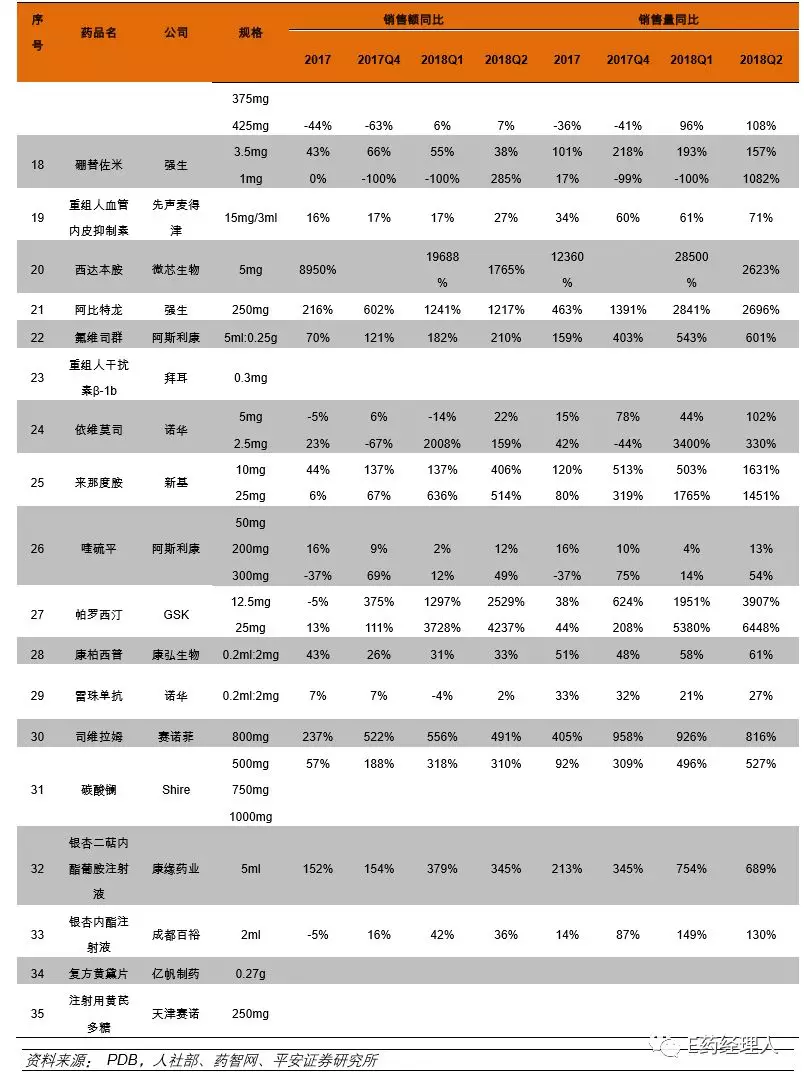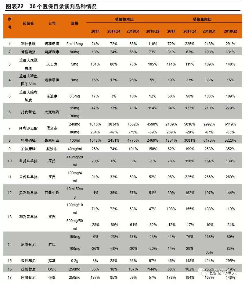 根据平安证券研报数据显示,36个谈判品种从2017年第三季度开始陆续进入地方医保乙类报销范围,由于不同省市新版医保目录执行进度不同,因此尽管2017第四季度多数谈判品种销量增速较之前提升较大,但整体真正大幅提升集中体现在2018年第一季度,并且在第二季度保持住了高位增长率。