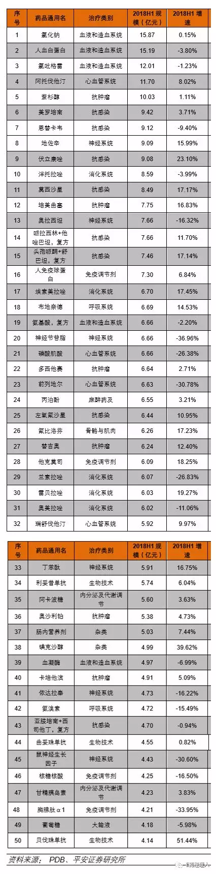 2018年上半年前50大品种中,临床效果不明显,药物经济学差的品种继续下滑。降幅超过20%的有前列地尔、鼠神经生长因子、兰索拉唑和磷酸肌酸,分别下滑30.78%、30.59%、26.83%和26.38%。