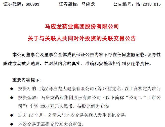 近日,马应龙发布公告称,为促进马应龙转型升级,整合社会资源,加快大健康产业发展,其拟与宁波梅山保税港区华翰裕源股权投资合伙企业、武汉同信健科技服务合伙企业共同发起设立注册资本为5000万元人民币的武汉马应龙大健康有限公司。其中,马应龙认缴出资现金3200万元,持股比例64%;华翰裕源认缴出资现金人民币1000万元,持股比例为20%;同信健认缴 出资现金人民币800万元,持股比例为16%。