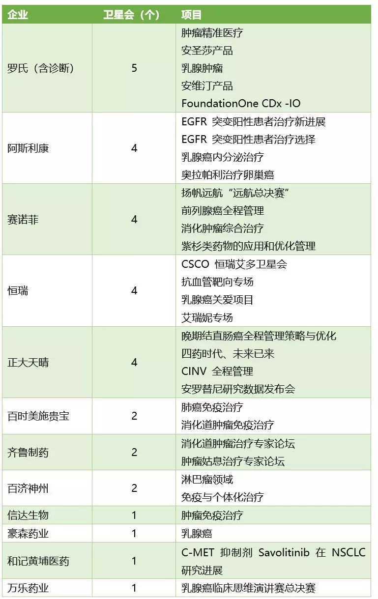 谁是本届CSCO卫星会开的最多的?小编根据会议日程进行了统计,举办了卫星会最多的企业是罗氏(含诊断),阿斯利康、赛诺菲、恒瑞、正大天晴以4场卫星会位居第二。