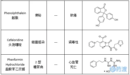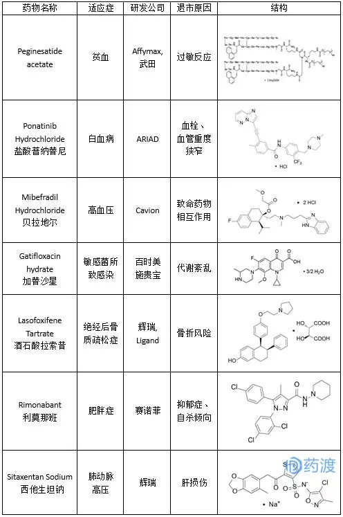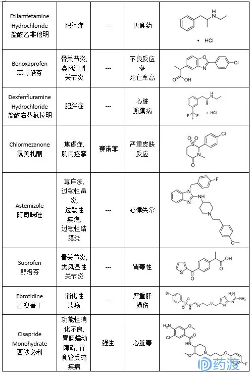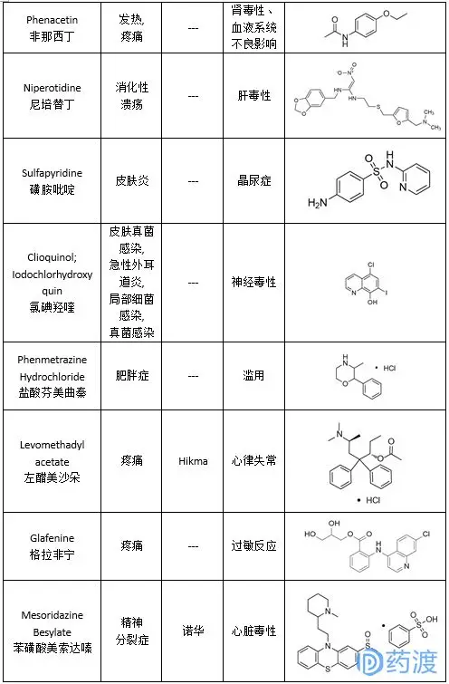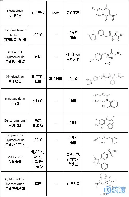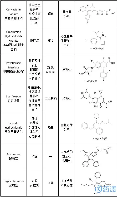 通过查询数据库、文献,如上所述,笔者共查到近142个化学药物已撤市,撤市原因主要集中于安全性问题及同类竞品竞争;其中,因安全性问题撤市药物共49个,详细情况见下表(附带结构)。