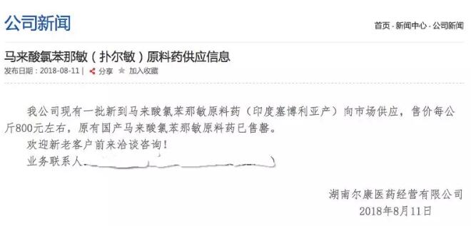 8月7日,尔康制药官网发布《马来酸氯苯那敏(扑尔敏)原料药供应信息》,称“公司现有一批新到马来酸氯苯那敏原料药(印度塞博利亚产)向市场供应,售价每公斤800元左右,原有国产马来酸氯苯那敏原料药已售罄”。