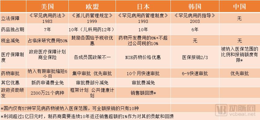 从表中可以看出政策已经开始补位,相信在未来会有更多的落实细则以及持续的政策跟进。因为对比国外为罕见病治疗创造的环境,国内还有巨大的空白。其中最重要的问题就是,国外罕见病药物的高价可以由商保托底报销,但是在国内,医保能在罕见病支付中承担多大的比例,还是个未知数。