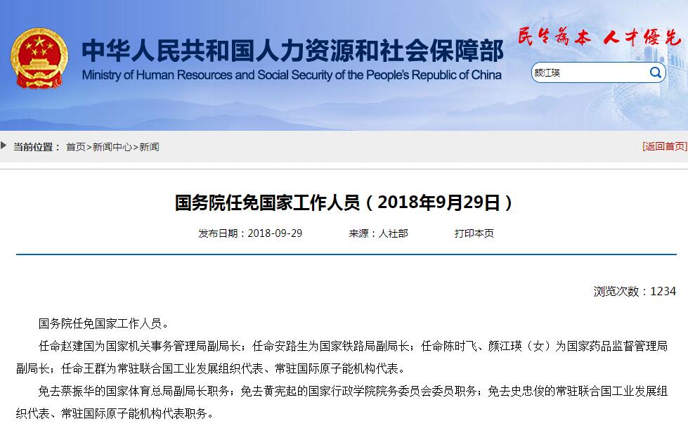 昨日(9月29日),国家人力资源和社会保障部发布《国务院任免国家工作人员(2018年9月29日)》,其中包括任命陈时飞、颜江瑛(女)为国家药品监督管理局副局长。