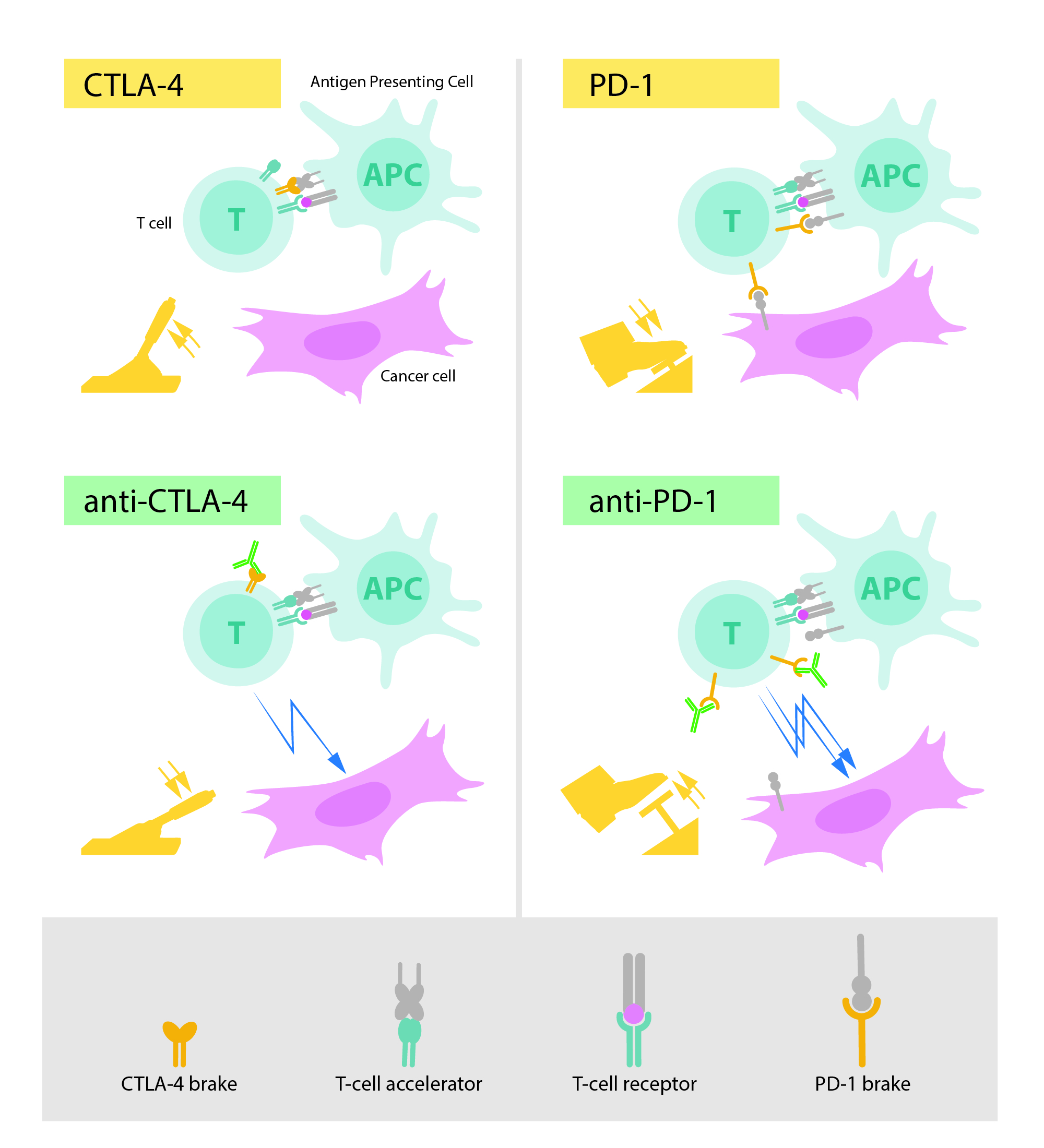上世纪90年代,詹姆斯·艾利森在加州大学伯克利分校的实验室里研究T细胞蛋白CTLA-4。他是发现CTLA-4可以作为T细胞刹车的科学家之一。其他研究团队将CTLA-4作为治疗自身免疫性疾病的靶点,但詹姆斯和他们的想法不同。他已经开发出一种可以与CTLA-4结合并阻断其功能的抗体。1994年底,詹姆斯和同事进行了第一次实验,在同年圣诞节的假期,又重复了这次实验,结果非常壮观,抗体把刹车关掉了,解锁了T细胞的抗肿瘤活性,结果治愈了患有癌症的小鼠。